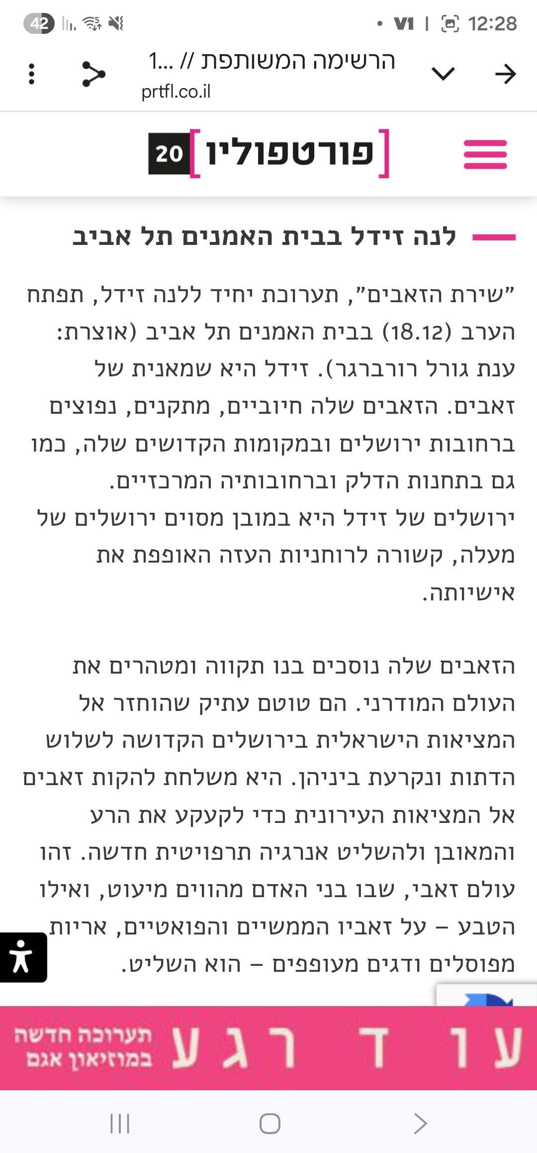 לנה זידל: מחווה, יוני-יולי 2020, גלריה אגריפס 12, ירושלים. הג'רוזלם פוסט, 21 ביוני 2020. בארי דייוויס: אמנות לכל הגילאים ומקומות