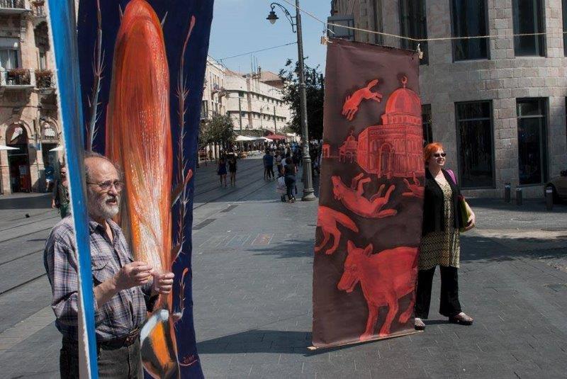 לנה זידל ואנטולי בסין, 2014, כיכר ציון, ירושלים, תערוכת רחוב במסגרת הפרויקט ART COMES OUT, צילום: לאוניד זייגר