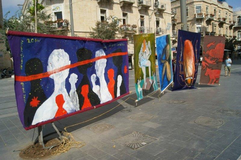 עבודות של: לנה זידל, לאוניד זיגר, אנטולי בסין, 2014, כיכר ציון, ירושלים, תערוכת רחוב במסגרת הפרויקט ART COMES OUT, אוצר:ליאוניד זייגר, צילום: איזמעיל גלין