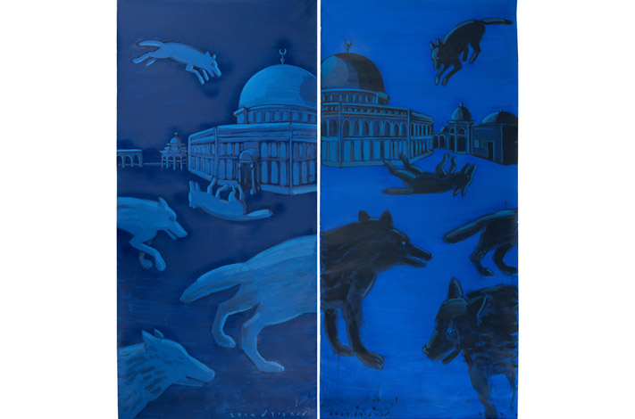 Lena Zaidel sends out her pack of wolves into the night, the Dome of the Rock Square, the Western Wall Square, and into other controversial places. For her, the wolf is a purifying and liberating figure. The Wolf of Branches creates movement and drawing in space and is a reminder of the hidden phenomena that take place in nature.